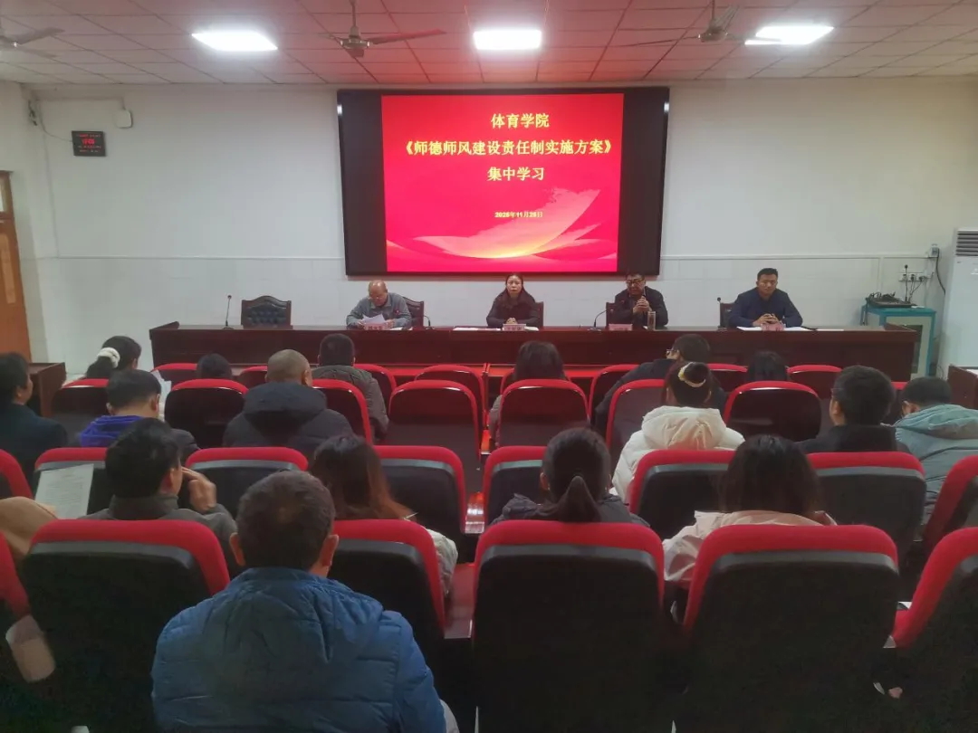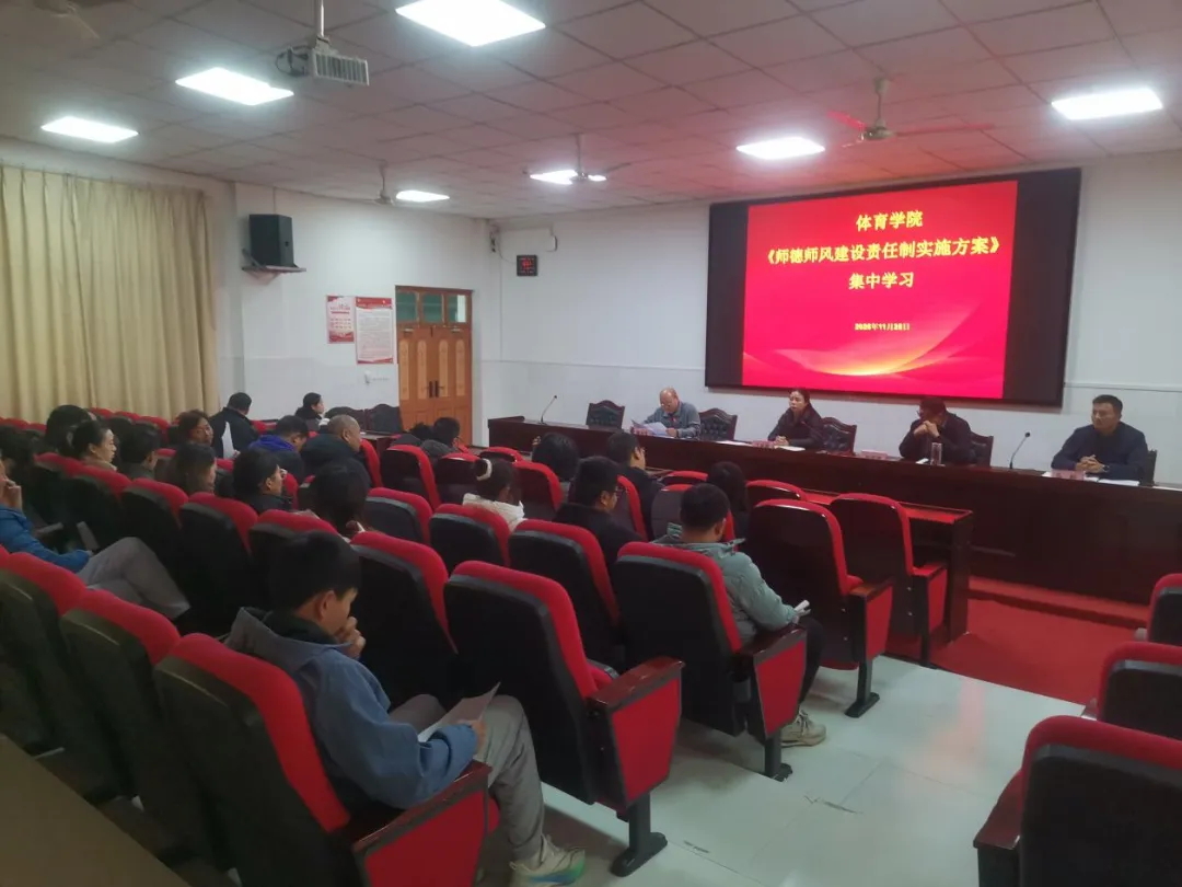 为深入贯彻落实立德树人根本任务,进一步强化全院教职工师德师风建设责任意识,规范从教行为,锻造新时代体育育人队伍,25日上午,体育学院组织全体教职工开展《漯河职业技术学院师德师风建设责任制实施方案》(以下简称《实施方案》)集中学习,学院领导班子、专任教师、行政管理人员及辅导员参加学习。